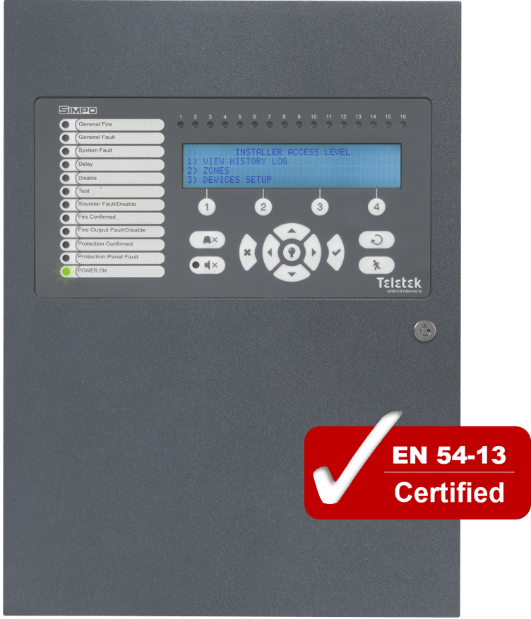 Адресируем пожароизвеститeлен контролен панел с 1 контур, разширяем до 2 контура. До 250 устройства в контур – серия SensoIRIS (макс 500mA). Поддържа 48 зони. Вграден LCD дисплей , светодиодна и звукова индикация. Следене състоянието на линиите и изходите. Програмируеми времеви интервали. Различни тестови режими. Енергонезависима памет с 10 000 събития. Възможност за конфигуриране от панела или софтуер ProsTE. Вграден 1x Enternet порт за локален или отдалечен достъп, Cloud свързаност и мобилна апликация. Различни нива на достъп. Поддържа разклонения на контура. Ръчна/Автоматична адресация. Интерфейси: 2x изхода за сирени DC24V/500mA със следене на състоянието, 3x релейни изхода NO/NC (Fire, Fault и EXT.) DC24V/300mA. 4x програмируеми релейни изхода NO/NC DC24V/15A. 3x специализирани входа. 1x USB за управление/конфигурация. Съвместими акумулатори 1х18Аh/12V. Захранване: 90~264VAC. Корпус с размери: 306x412x81.2mm/4.2kg. EN Стандарти: БДС EN 54-2:1997 /A1:2006 /AC: 2009, EN54-4:1997/A2:2006/AC:2009.